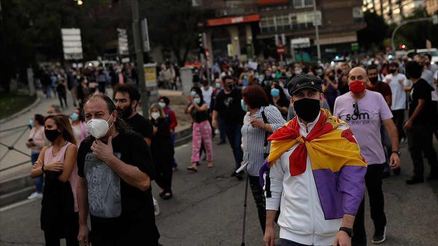Madrid özerk yönetim hükümeti tarafından açıklanan ve yarından itibaren yürürlüğe girecek dolaşım kısıtlamalarını da içeren yeni önlemlere karşı 100’e yakın mahallede gösteri düzenlendi.