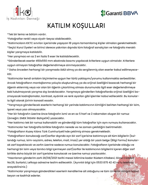 İş Kadınları Derneği’nden yapılan açıklamada, Garanti Bankası sponsorluğunda gerçekleştirilen “İşte Kadın” Fotoğraf Yarışmasının başvurularının 28 Ağustos’a kadar devam edeceği ve sonuçlarının ise 17 Eylül’de Grand Pasha Otel Lefkoşa’da açıklanacağı belirtildi.