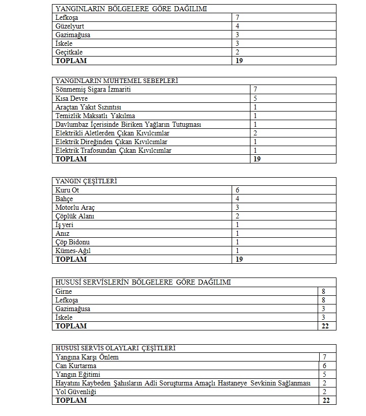 Hususi servis olayları ise, trafik kazası sonucu yola dökülen yağların üzerine toprak atılarak yol güvenliğinin sağlanması, araçların motor kısmında ve klima dış ünitesi içerisinde mahsur kalan kedi ve kumrunun kurtarılması, asansörde mahsur kalan şahısların kurtarılması, hayatını kaybeden şahısların adli soruşturma amaçlı devlet hastanesi morguna sevk edilmesi ve Necat British College, Bellapais School, 23 Nisan ve Lapta İlkokulu öğrencilerine, öğretmenlerine ve çalışanlarına yangın eğitimi verilmesi olarak yer aldığı kaydedildi.