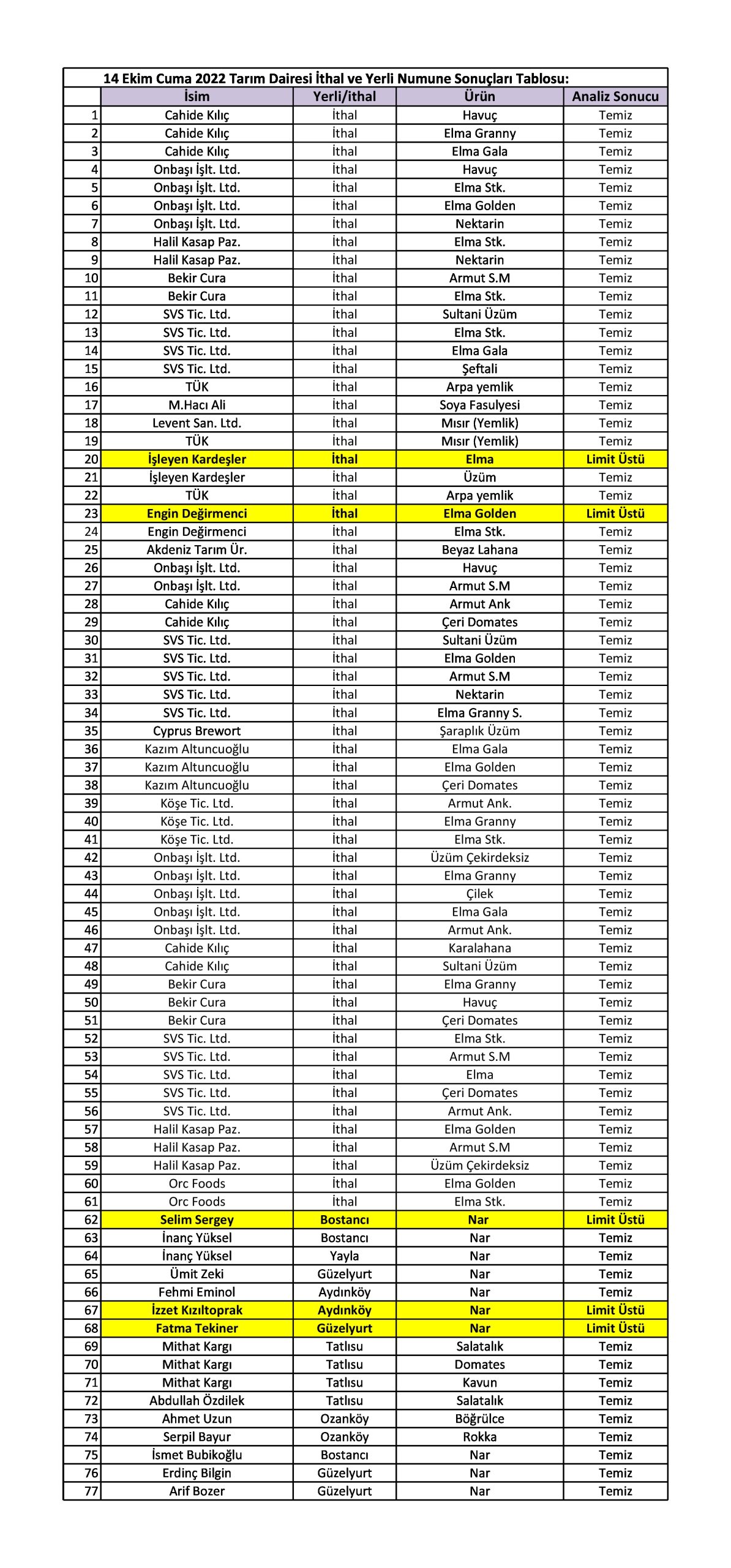 Tarım Dairesi 7-13 Ekim  tarihlerini kapsayan gıda denetim sonuçlarını açıkladı.