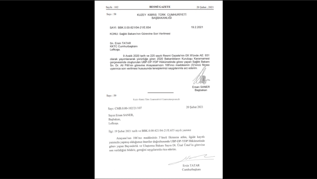 Başbakan Ersan Saner’in Sağlık Bakanı Ali Pilli’nin ve Bayındırlık ve Ulaştırma Bakanı Ünal Üstel’in görevlerinden alınması ve Sağlık Bakanlığı’na Ünal Üstel’in, Bayındırlık ve Ulaştırma Bakanlığı’na ise Resmiye Canaltay’ın atanmasıyla ilgili Cumurbaşkanı’na gönderdiği yazılar ve Cumhurbaşkanı Ersin Tatar’ın söz konusu görevden alma ve atamaları uygun görüp onayladığına dair belgeler Resmi Gazete’de yer aldı.