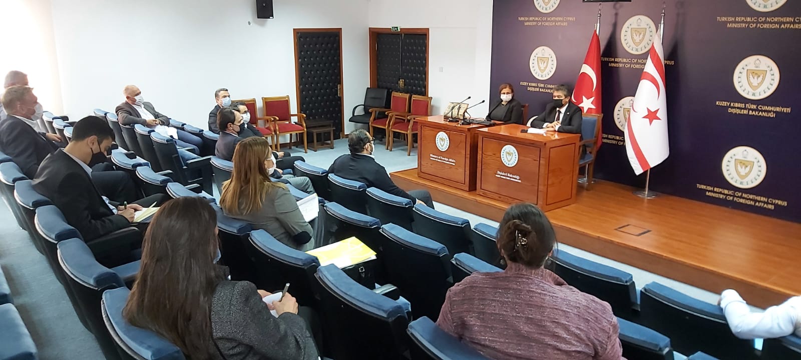 Esnaf ve Zanaatkarlar Odası Başkanı Mahmut Kanber, Otelciler Birliği Başkanı Dimağ Çağıner, Ticaret Odası Başkanı Turgay Deniz, Casino İşletmecileri Birliği Koordinatörü Ayhan Sarıçiçek, Kıbrıs Türk İnşaat Müteahhitleri Birliği Başkanı Cafer Gürcafer ve Sanayi Odası’nı temsilen Yönetim Kurulu üyesi Çavlan Paralik’in katıldığı toplantı, Dış İşleri Bakanlığı Uğur Umar Konferans Salonu’nda gerçekleştirildi.