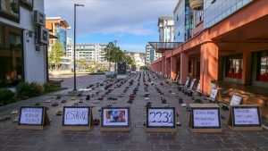 Karadağ’ın başkenti Podgorica’daki Sağlık Bakanlığı binası önüne bırakılan 2 bin 231 ayakkabı ile yeni tip koronavirüs (Kovid-19) salgınında hayatını kaybedenler anıldı.
