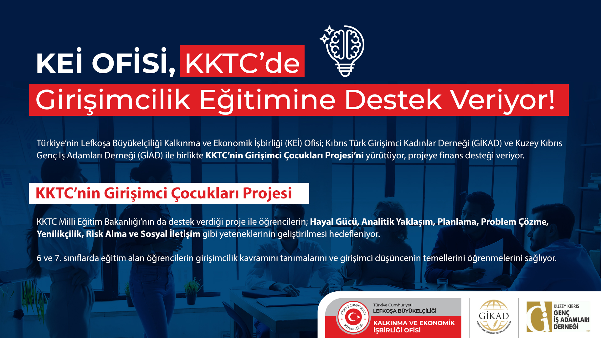 Türkiye’nin Lefkoşa Büyükelçiliği Kalkınma ve Ekonomik İşbirliği (KEİ) Ofisi, Kıbrıs Türk Girişimci Kadınlar Derneği (GİKAD) ve Kuzey Kıbrıs Genç İş Adamları Derneği’nin (GİAD) “KKTC’nin Girişimci Çocukları Projesi” adıyla birlikte yürüttüğü projeye finans desteği verdiğini açıkladı.