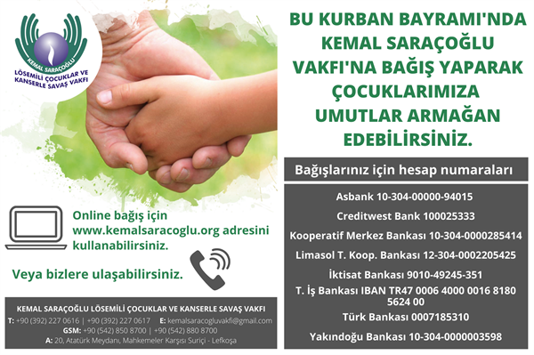 “Bayramlar, mutluluğu paylaşırsak, ihtiyacı olanlara umutlar armağan edebilirsek daha çok anlam kazanır” denilen açıklamada, kurban bağışlarının Kemal Saraçoğlu Vakfı’nın banka hesap numaralarına, www.kemalsaracoglu.org adresinden online olarak, Atatürk Meydanı No:20 Mahkemeler Karşısı/Lefkoşa’da bulunan vakıf binasına giderek veya +90 392 227 0616-17 veya +90 542 850 8700 - +90 542 880 8700 numaralı telefonlardan vakıf personeline ulaşarak gerçekleştirilebileceği belirtildi.