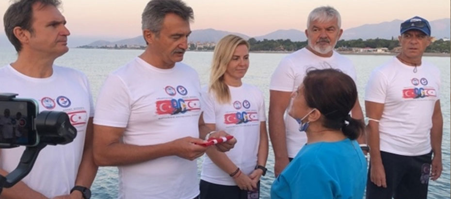 Bu yıl ikincisi düzenlenen “Bayrağımız Kulaçlarla Kıbrıs’a” etkinliği için Anamur İskelesi’nde bir araya gelen ilçe protokolü, Tüzmen ve yüzücülere Türk bayrağını teslim etti.