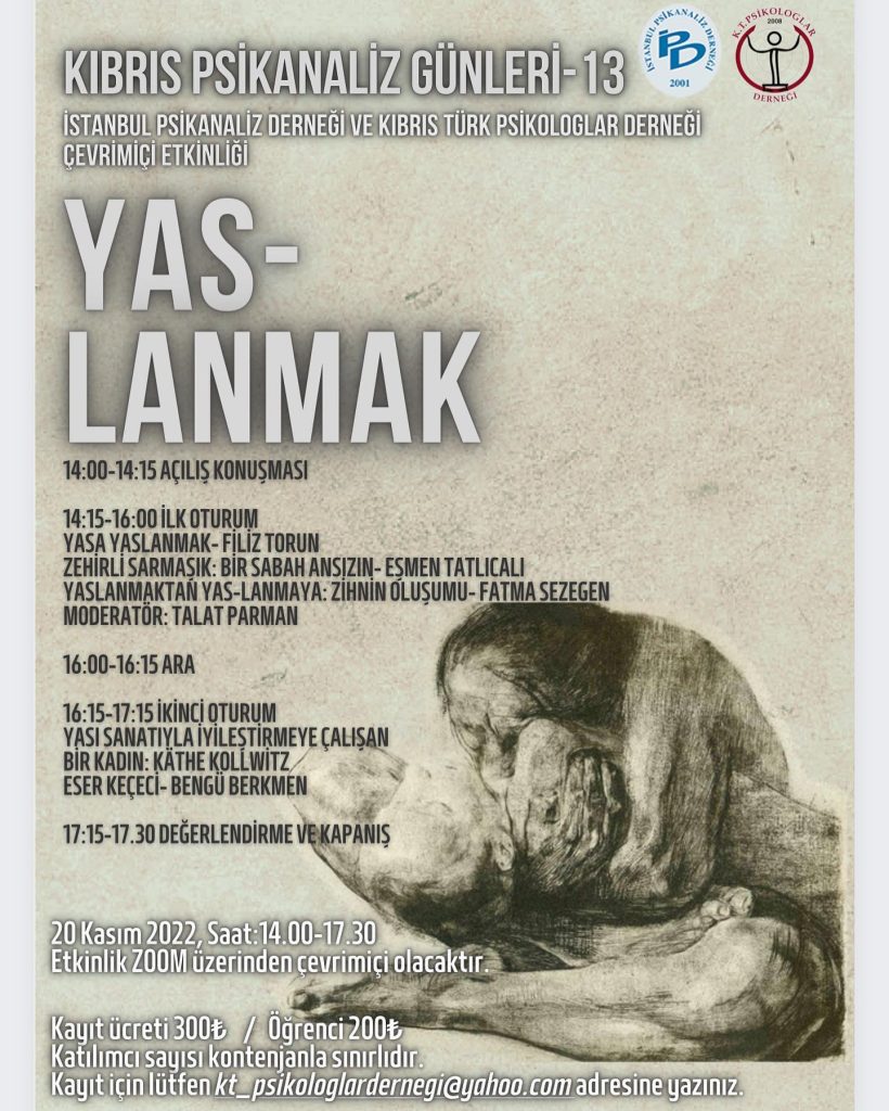 Kıbrıs Türk Psikologlar Derneği’nden verilen bilgiye göre, etkinlikte Filiz Torun “Yasa Yaslanmak”, Eşmen Tatlıcalı “Zehirli Sarmaşık: Bir sabah, Ansızın…” Fatma Sezegen “Yaslanmaktan Yas-lanmaya: Zihnin Oluşumu”, Eser Keçeci ve Bengü Berkmen de “Yası Sanatıyla İyileştirmeye Çalışan Bir Kadın: Käthe Kollwitz” konu başlıklarında konuşacak.