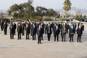 Törende anıta çelenk sunuldu. Saygı duruşu ve İstiklal Marşı eşliğinde bayrakların göndere çekilmesinin ardından Cumhurbaşkanı Tatar tarafından Anıt Özel Defteri’nin imzalanmasıyla tören sona erdi.