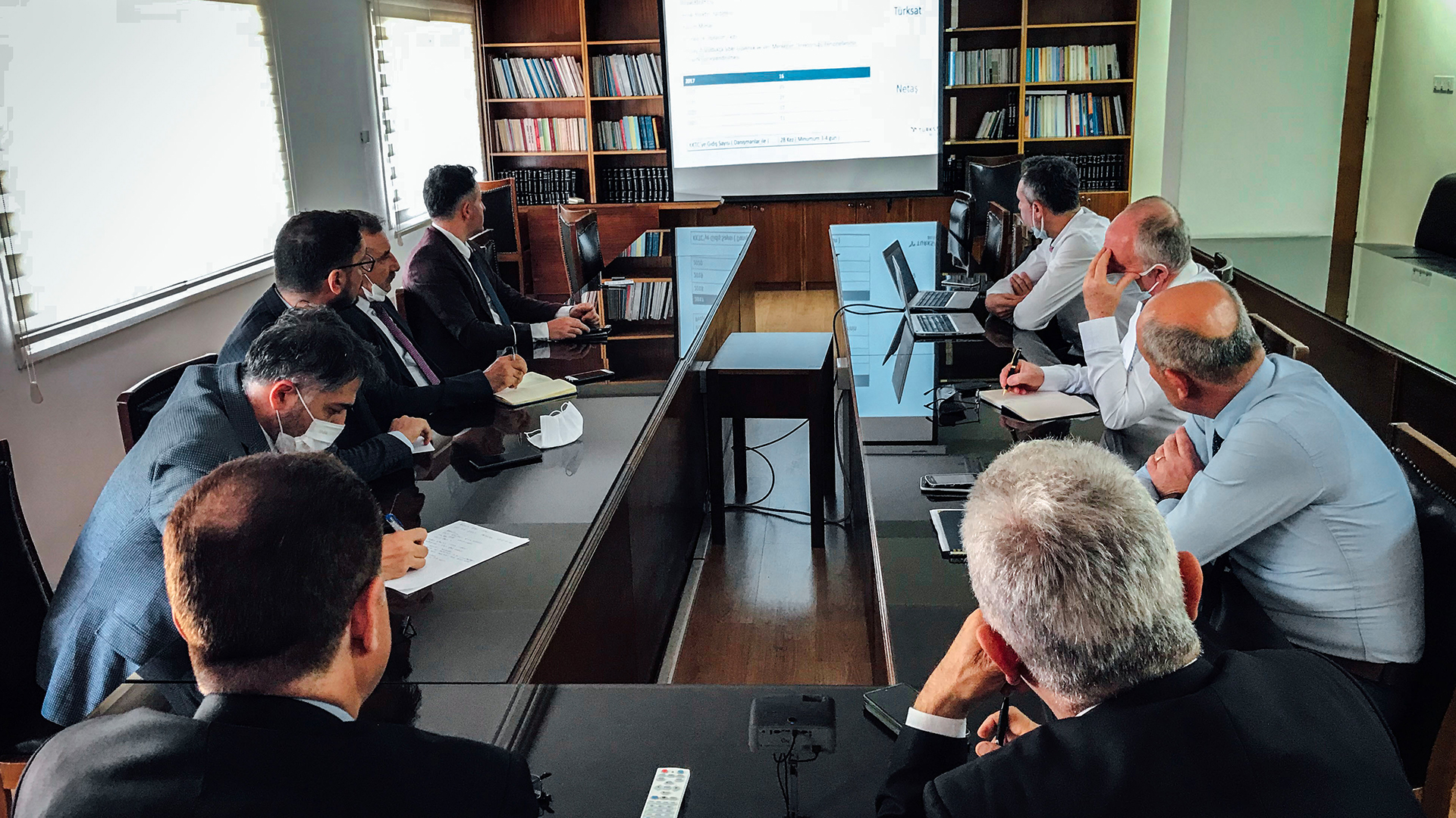 Ercan Havaalanı’nda KKTC Gümrük Bilgi Sistem Altyapısını yerinde tespit eden Cumhurbaşkanlığı Dijital Dönüşüm Ofisi ile TÜRKSAT görevlileri, Bayındırlık ve Ulaştırma Bakanlığı Müsteşarı, e-Devlet Yürütme Kurulu Başkanı Suat Yeldener, Maliye Bakanlığı Genel Koordinatörü Özdemir Kalkanlı, Gümrük Dairesi Müdürü Mustafa Deveci, Gümrük Dairesi Müdür Muavini Cemal Gürsel Beyazbayram ve Türkiye’nin Lefkoşa Büyükelçiliği Gümrük Müşaviri Eyüp Gönültaş’ın katıldığı toplantıda uygulamada gelinen son aşamayla ilgili sunum yaptı.