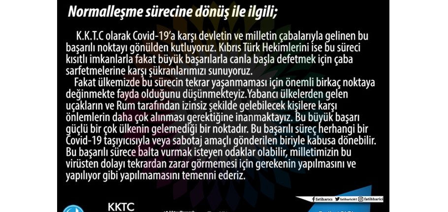 Açıklamada, “Yabancı ülkelerden gelen uçakların ve Rum tarafından izinsiz şekilde gelebilecek kişilere karşı önlemlerin daha çok alınması gerektiğine inanmaktayız. Bu büyük başarı, güçlü birçok ülkenin gelemediği bir noktadır. Bu başarılı süreç herhangi bir Covid-19 taşıyıcısıyla veya sabotaj amaçlı gönderilen biriyle kabusa dönebilir. Bu başarılı sürece balta vurmak isteyen odaklar olabilir” denildi.