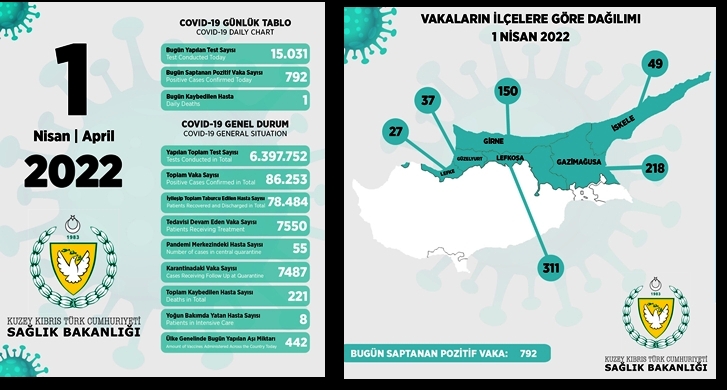 KKTC‘de, son 24 saatte yapılan test sayısı 15.031 olup, 1 kişi vefat etmiş, 792 pozitif vakaya rastlanmıştır.