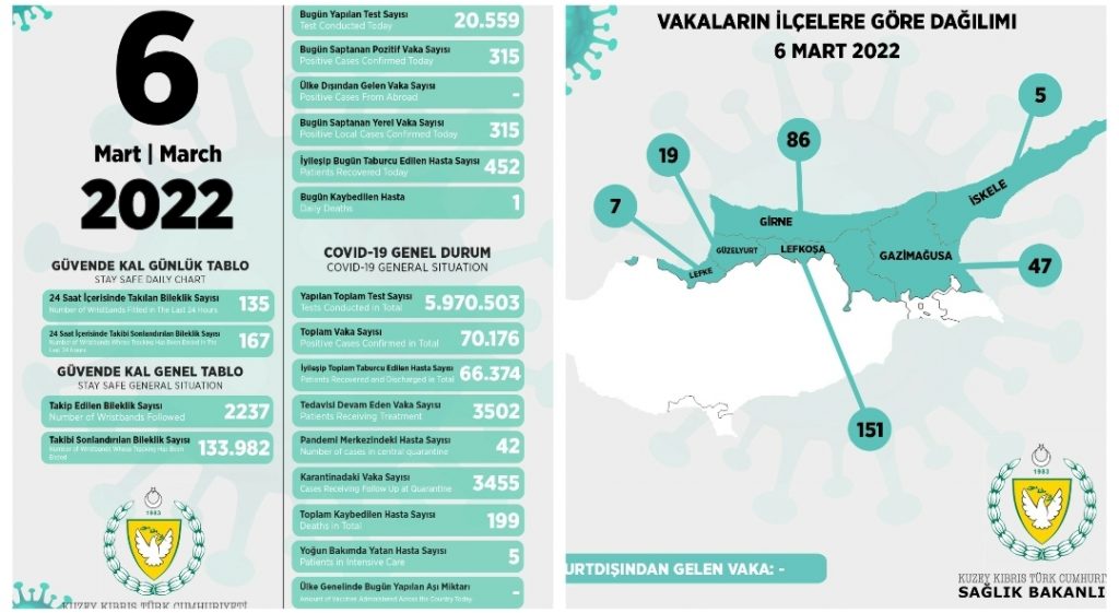 KKTC‘de son 24 saatte yapılan test sayısı 20.559 olup, 315 pozitif vakaya rastlanmış, 1 kişi vefat etmiş, 452 kişi taburcu edilmiştir.