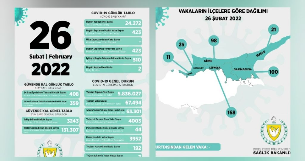Son 24 saatte yapılan test sayısı 24.272 olup, 423 pozitif vakaya rastlanmış, 2 kişi vefat etmiş, 510 kişi taburcu edilmiştir.