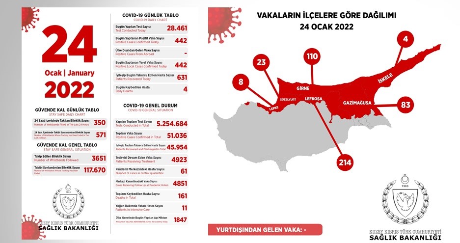 Son 24 saatte yapılan test sayısı 28.461 olup, 442 pozitif vakaya rastlanmış, 4 kişi vefat etmiş, 631 kişi taburcu edilmiştir.