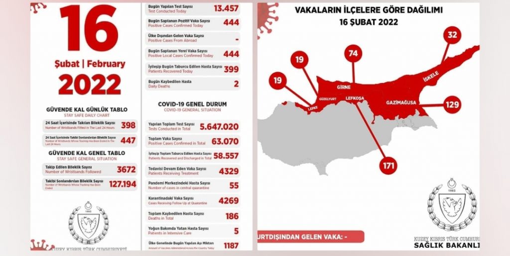 KKTC‘de son 24 saatte yapılan test sayısı 13.457 olup, 444 pozitif vakaya rastlanmış, 2 kişi vefat etmiş, 399 kişi taburcu edilmiştir.