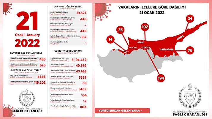 Son 24 saatte yapılan test sayısı 19.626 olup, 445 pozitif vakaya rastlanmış, 862 kişi taburcu edilmiştir.