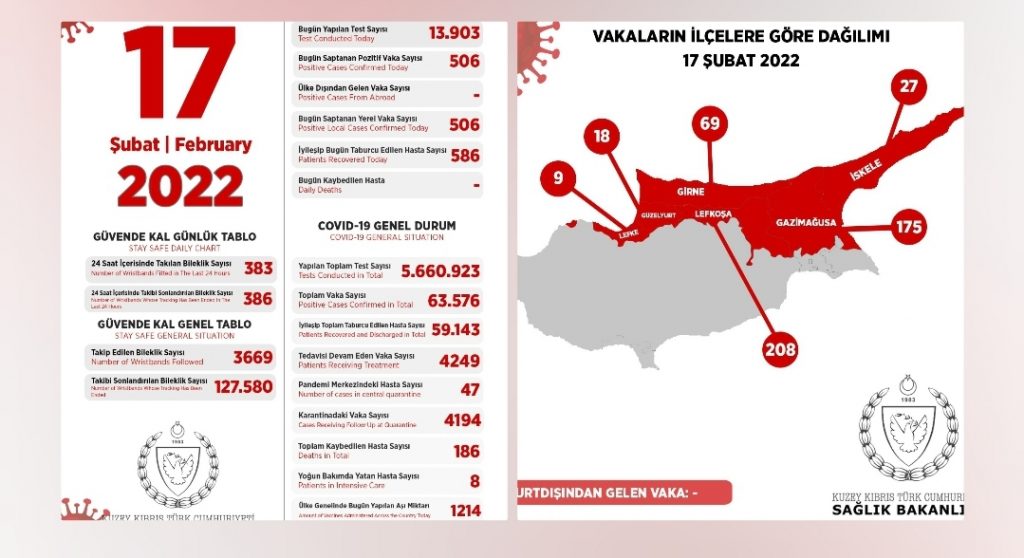 KKTC‘de son 24 saatte yapılan test sayısı 13.903 olup, 506 pozitif vakaya rastlanmış, 586 kişi taburcu edilmiştir.