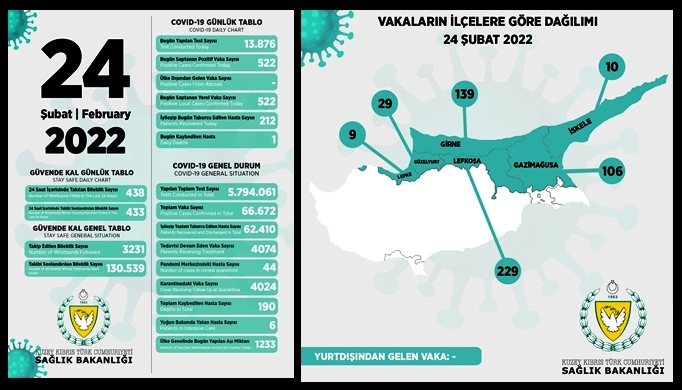 KKTC‘de son 24 saatte yapılan test sayısı 13.876 olup, 522 pozitif vakaya rastlanmış, 1 kişi vefat etmiş, 212 kişi taburcu edilmiştir.