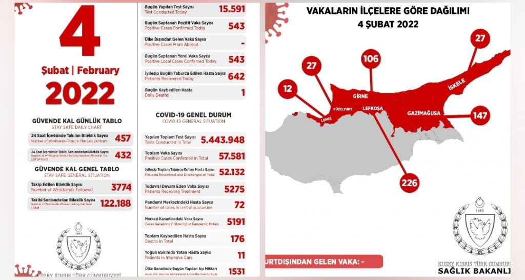 KKTC‘de son 24 saatte yapılan test sayısı 15.591 olup, 543 pozitif vakaya rastlanmış,1 kişi vefat etmiş, 642 kişi taburcu edilmiştir.