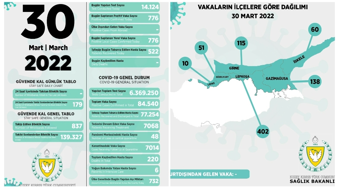 Son 24 saatte yapılan test sayısı 14.124  olup, 776 pozitif vakaya rastlanmış, 522 kişi taburcu edilmiştir.