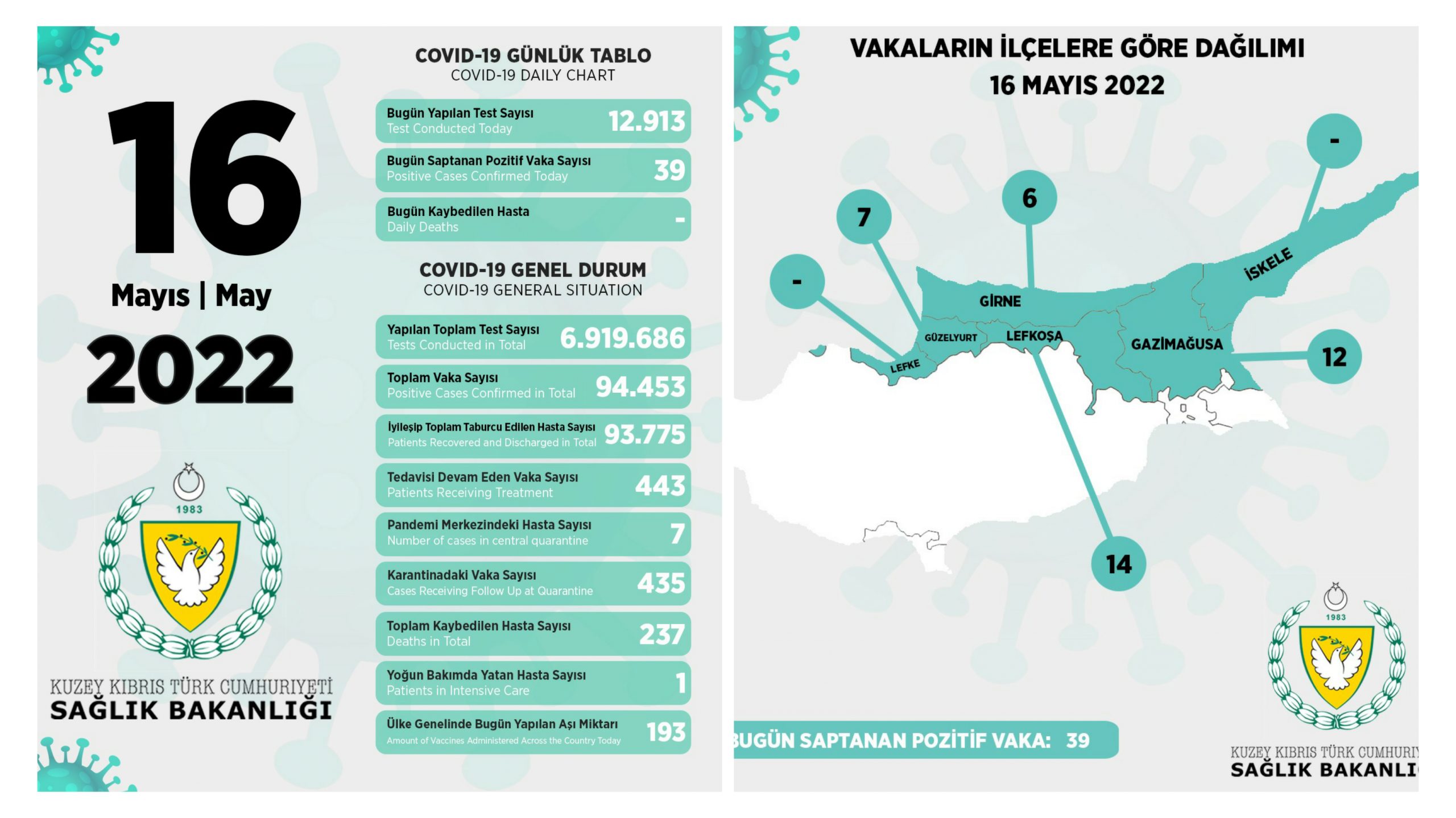 KKTC‘de son 24 saatte yapılan test sayısı 12.913 olup, 39 pozitif vakaya rastlanmıştır.