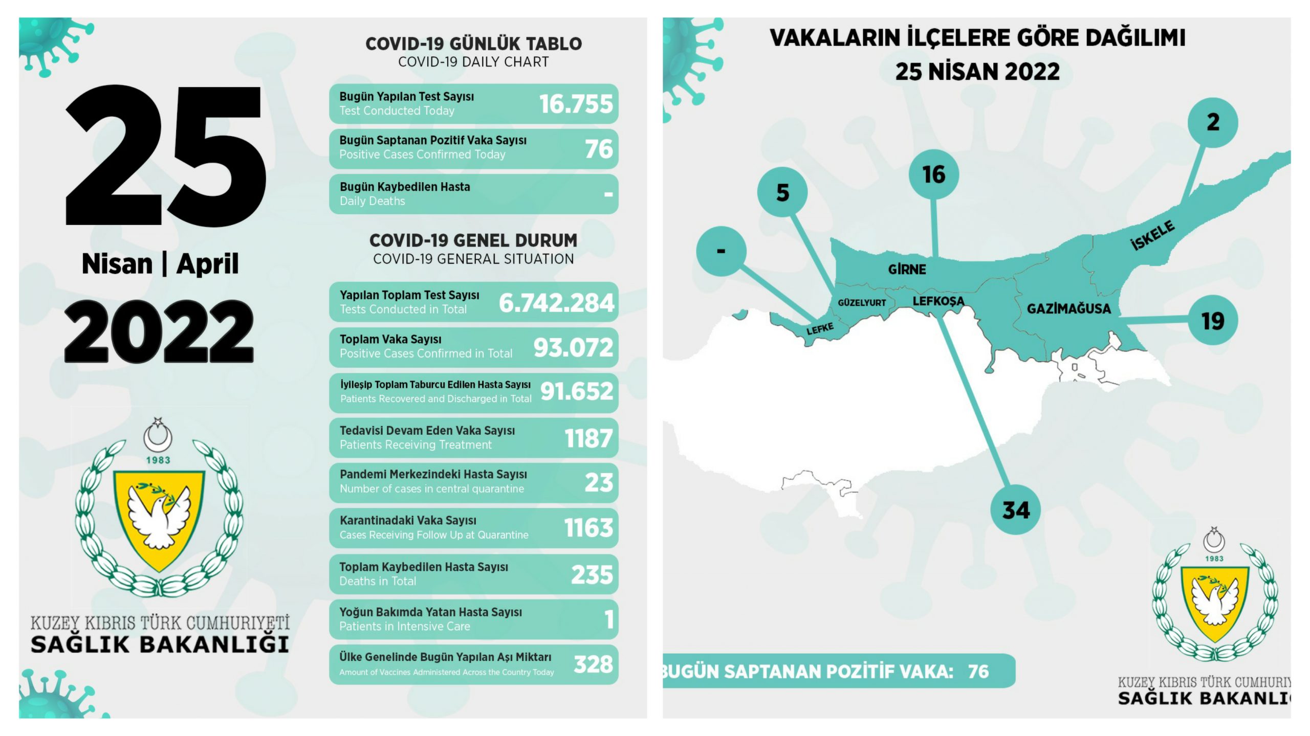 Son 24 saatte yapılan test sayısı 16.755 olup, 76 pozitif vakaya rastlanmıştır