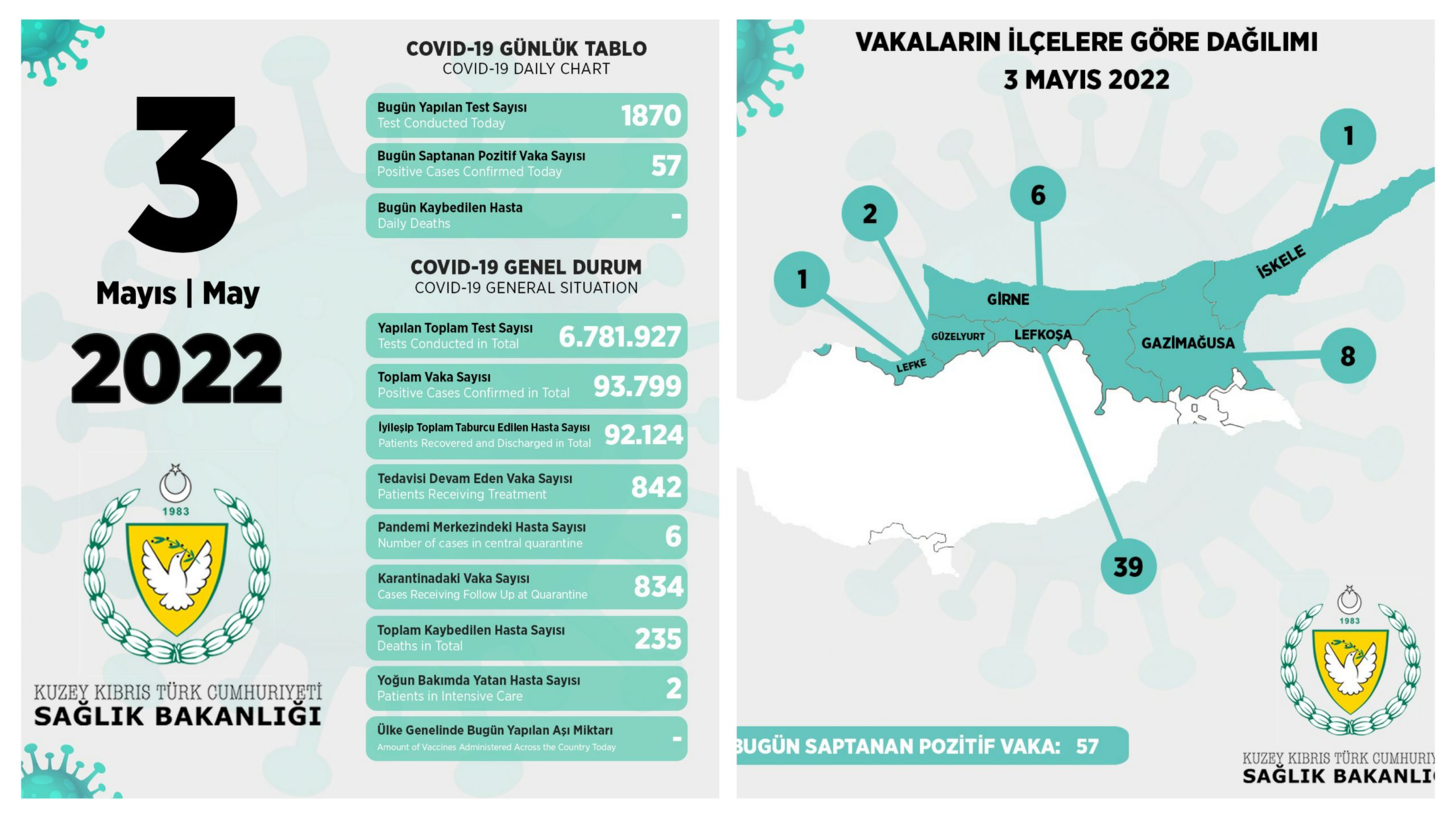 KKTC‘de son 24 saatte yapılan test sayısı 1870 olup, 57 pozitif vakaya rastlanmıştır.