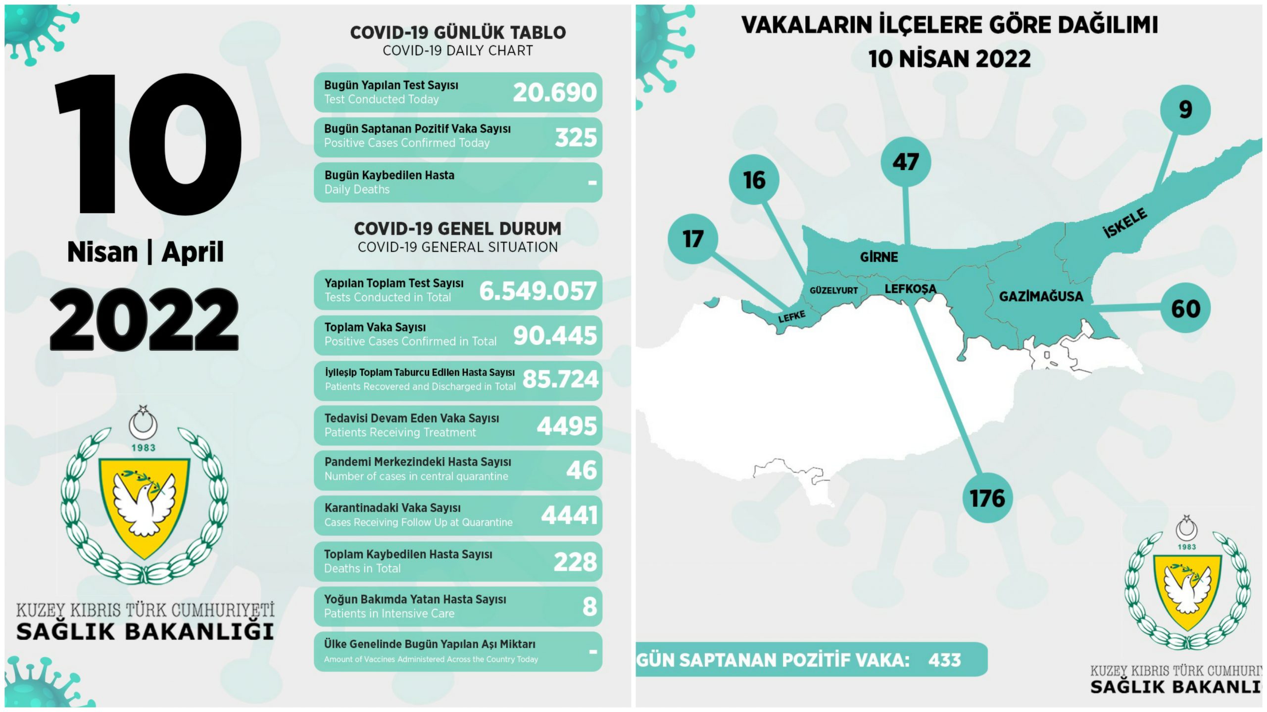KKTC‘de son 24 saatte yapılan test sayısı 20.690 olup, 325 pozitif vakaya rastlanmıştır.