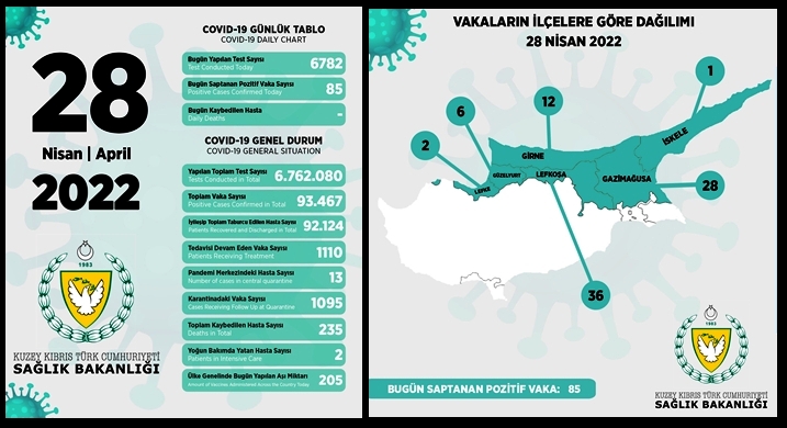 KKTC‘de son 24 saatte yapılan test sayısı 6782 olup, 85 pozitif vakaya rastlanmıştır”