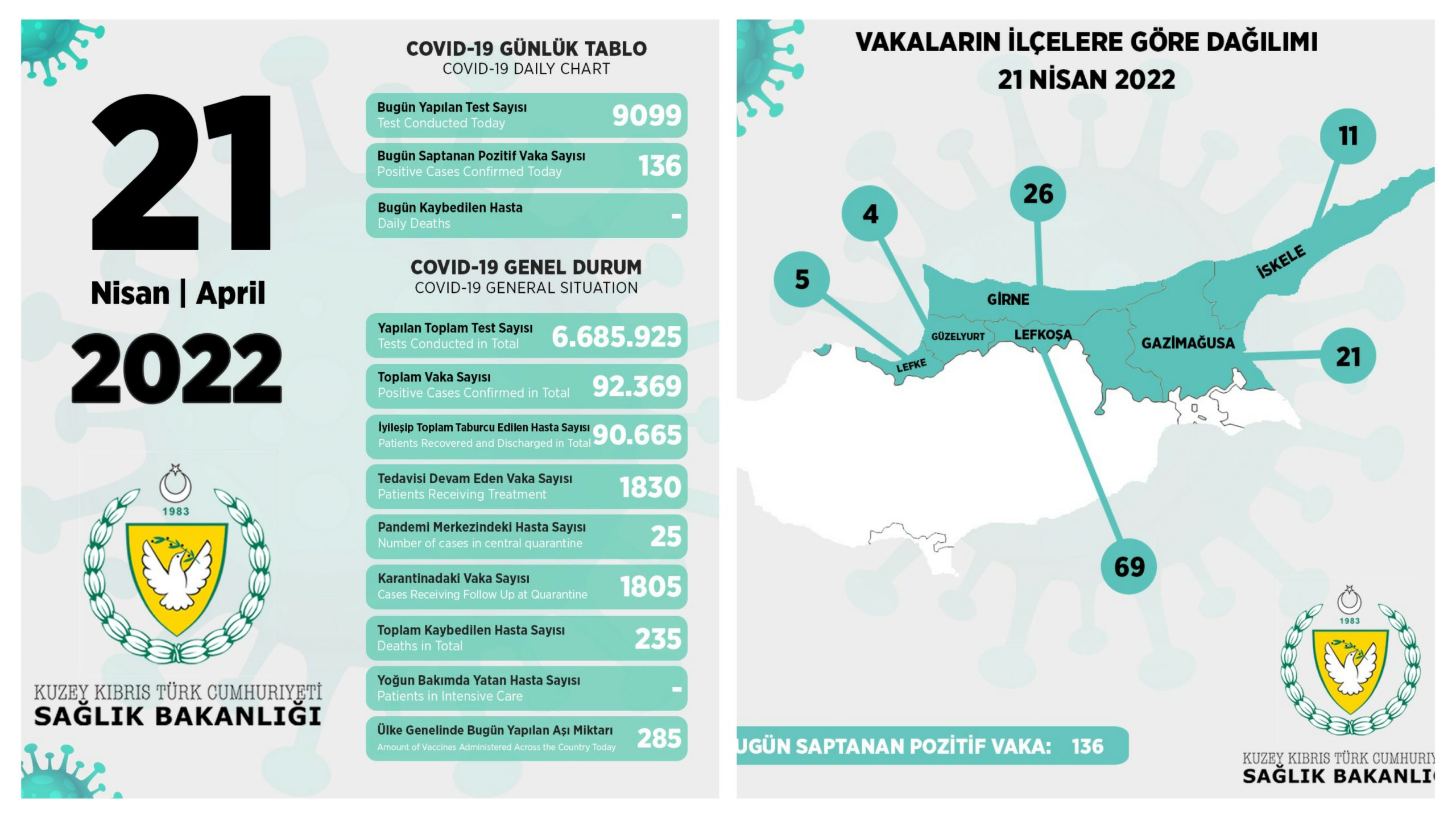 Son 24 saatte yapılan test sayısı 9099 olup, 136 pozitif vakaya rastlanmıştır”
