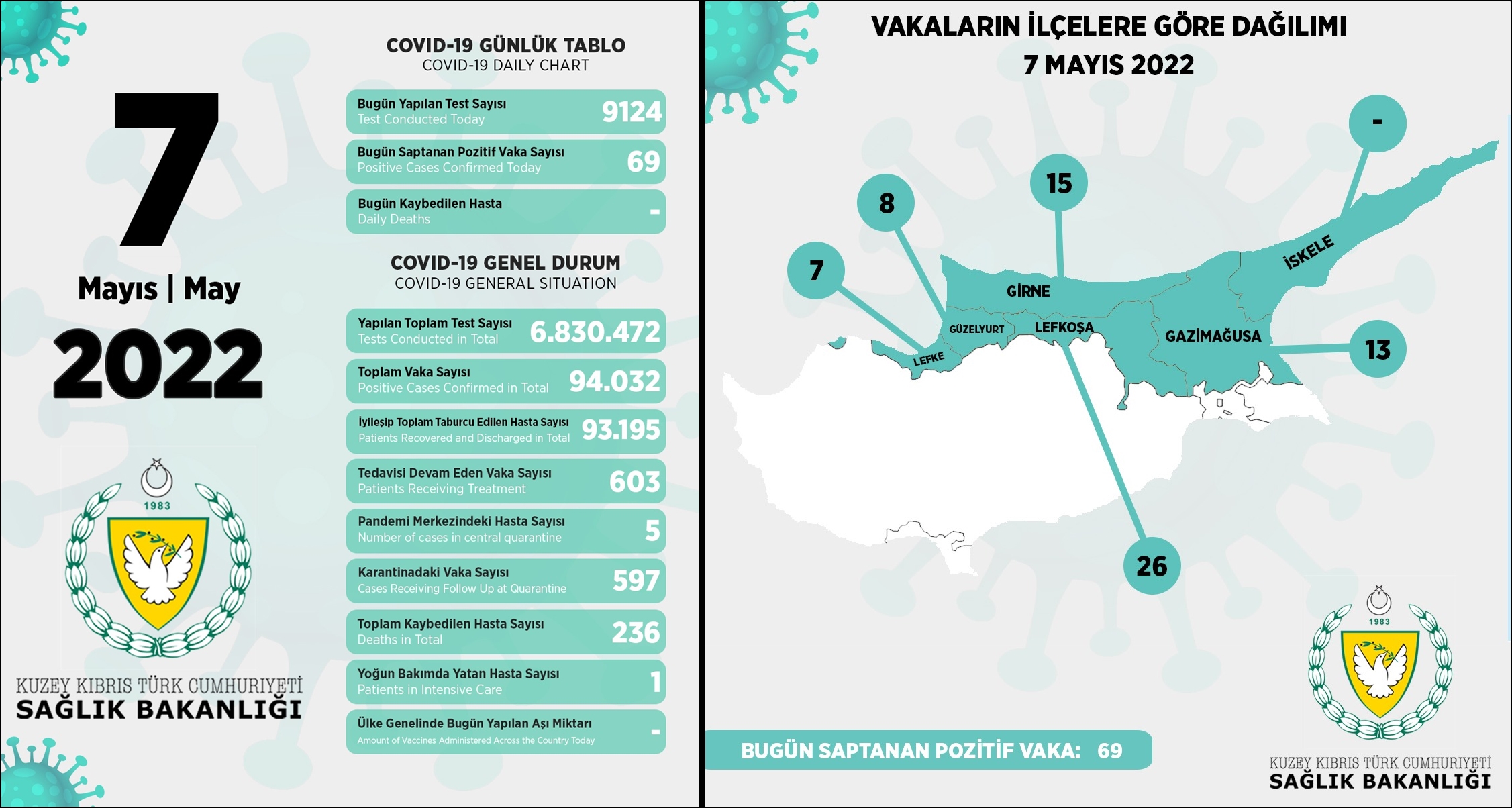 KKTC‘de son 24 saatte yapılan test sayısı 9124 olup, 69 pozitif vakaya rastlanmıştır.
