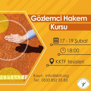 Kuzey Kıbrıs Tenis Federasyonu tarafından 2022 yılı faaliyet takvimi içerisinde yer alan Gözlemci Hakemlik Kursu 17-19 Şubat 2022 tarihleri arasında federasyon tesislerinde yapılacak. Federasyon kursalar için başvuruların başladığını, başvuru yapmak isteyenlerin mail veya telefoniyen müracaatta bulunabileceğini duyurdu.