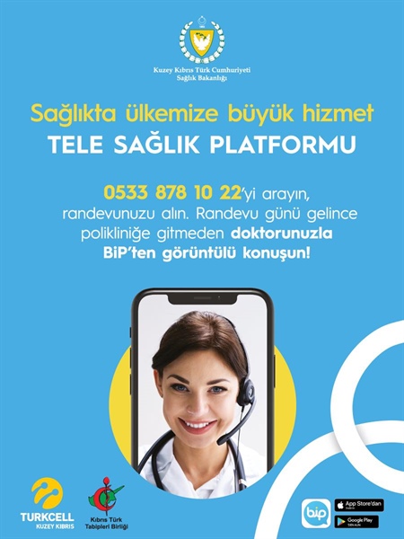 Sağlık Bakanlığı himayelerinde, Kıbrıs Türk Tabipleri Birliği ve Kuzey Kıbrıs Turkcell iş birliği ile kurulan Tele Sağlık Platformu’nun, Covid-19 salgını nedeni ile hastanelerdeki yoğunluğu azaltarak doktor ve sağlık çalışanlarını korumak, aynı zamanda halka, hastaneye gitmeye gerek kalmadan belli ölçüde sağlık hizmeti sunabilmek amacıyla hayata geçirildiği bildirildi.