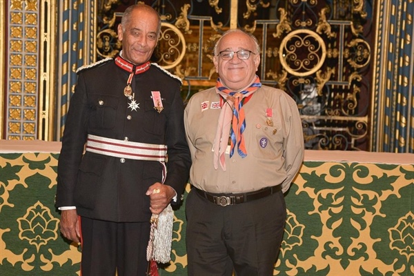 Türk toplumuna ve izciliğe yapmış olduğu üstün ve özverili hizmetlerinden dolayı Kraliçenin İmparatorluk Onur Payesine layık görülen Celal İzcibayar törene izci üniforması ile katıldı.