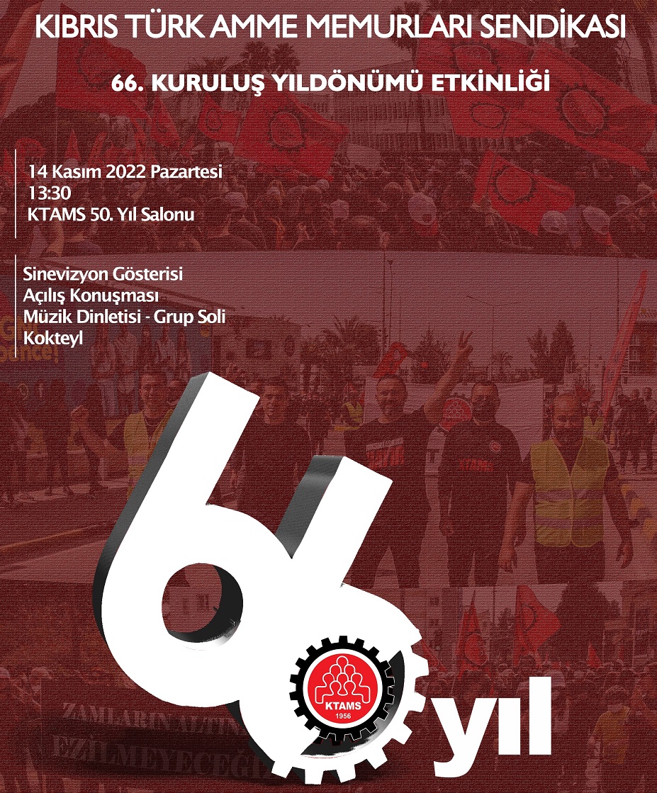 Kıbrıs Türk Amme Memurları Sendikası’nın (KTAMS), 66’ncı kuruluş yıl dönümü nedeniyle Pazartesi günü etkinlik düzenlenecek.