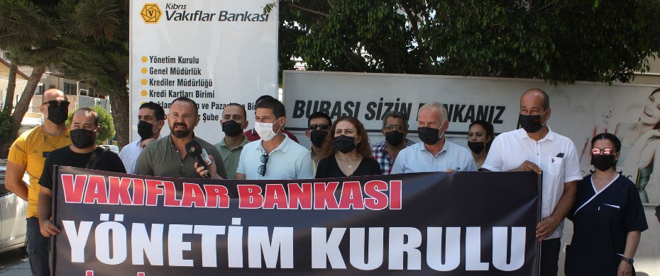 Sendika yetkilileri, Kıbrıs Vakıflar Bankası Genel Müdürlüğü binası önünde toplanarak basın açıklaması yaptı.