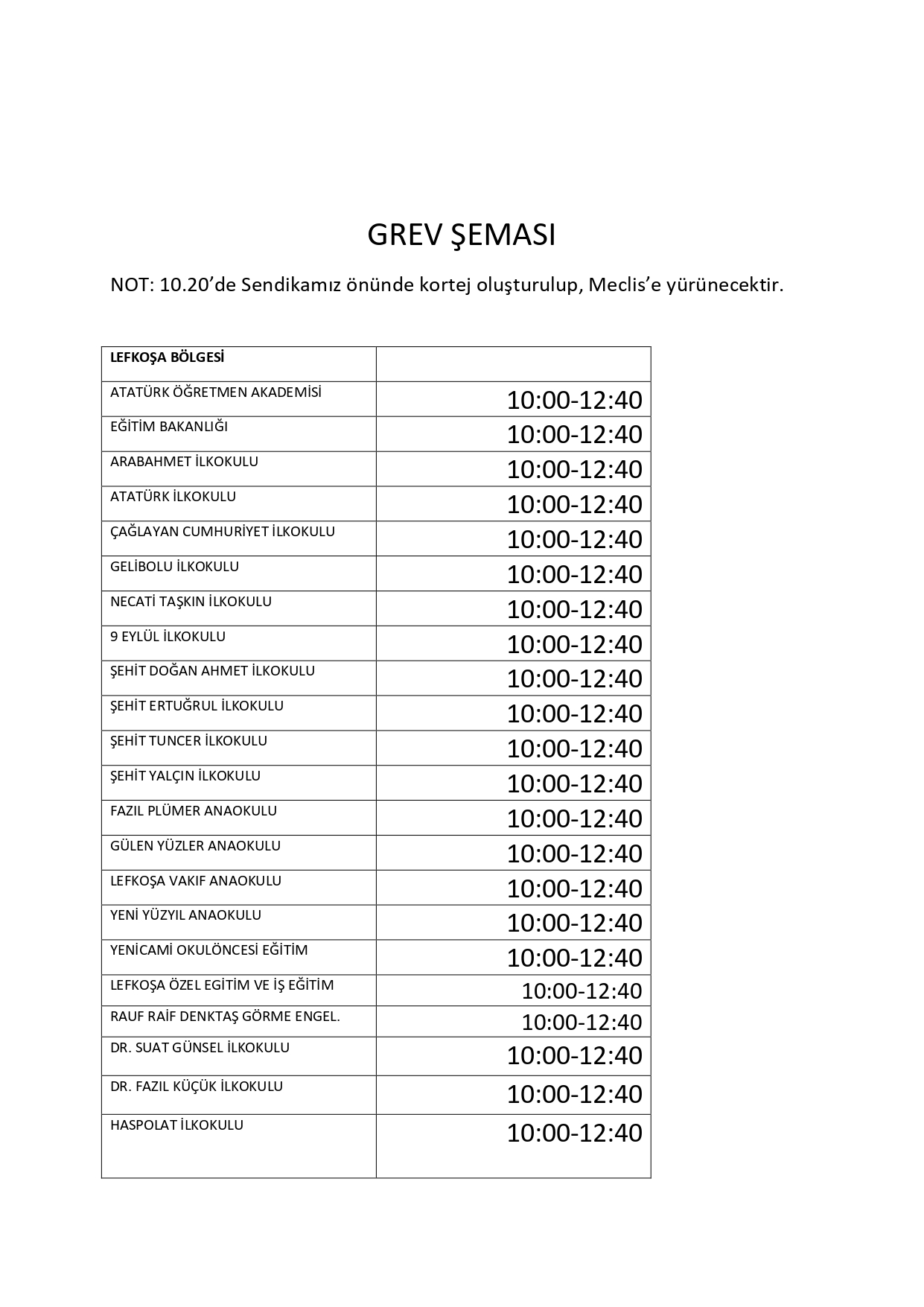 Kıbrıs Türk Öğretmenler Sendikası (KTÖS), Salı günü Sendikal Platformun düzenleyeceği eylem, yürüyüş ve mitinge okullarda greve giderek katılım sağlayacaklarını kaydederek, okullarda uygulanacak grev saatlerini açıkladı.