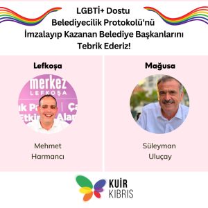 Açıklamada, “Kuir Kıbrıs Derneği olarak, seçilen başkanlar ile görev süreleri boyunca LGBTİ+ Dostu Belediyecilik Protokolü kapsamında taahhüt ettikleri konular ile ilgili işbirliği içinde olmayı diler ve birlikte LGBTİ+ dostu bir şehir yaratılmasının heyecanı içinde olduğumuzu belirtmek isteriz” denildi.