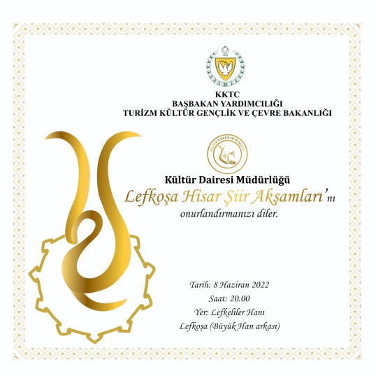 Başbakan Yardımcılığı, Turizm, Kültür, Gençlik ve Çevre Bakanlığı’na bağlı Kültür Dairesi, 8 Haziran Çarşamba akşamı saat 20.00’de Lefkeliler Hanı’nda (Büyük Han arkası) “Lefkoşa Hisar Şiir Akşamları” etkinliği düzenleyecek.
