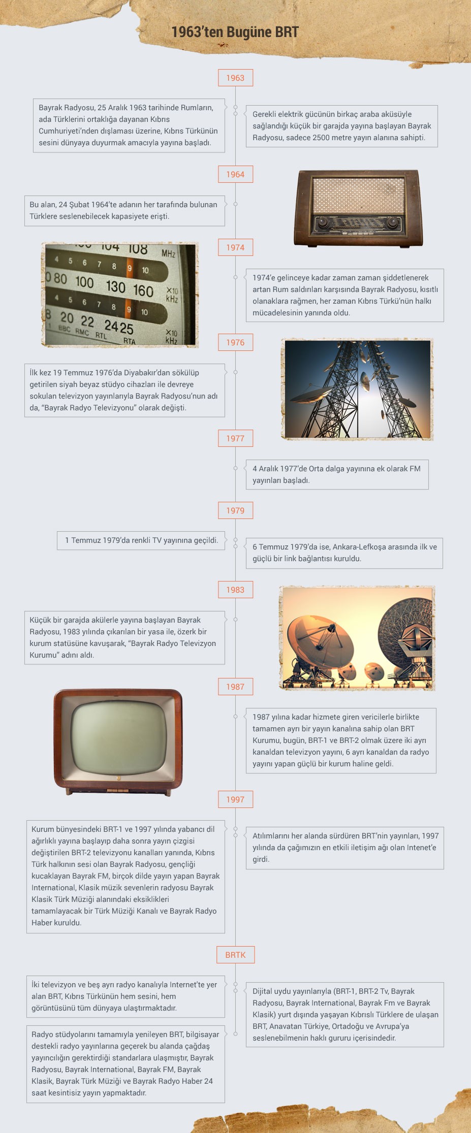 1963: Bayrak Radyosu 25 Aralık 1963 tarihinde Rumların ada Türklerini ortaklığa dayanan Kıbrıs Cumhuriyeti’nden dışlaması üzerine Kıbrıs Türkü’nün sesini dünyaya duyurmak amacıyla yayına başladı. Gerekli elektrik gücünün birkaç araba aküsüyle sağlandığı küçük bir garajda yayına başlayan Bayrak Radyosu, sadece 2500 metre yayın alanına sahipti.