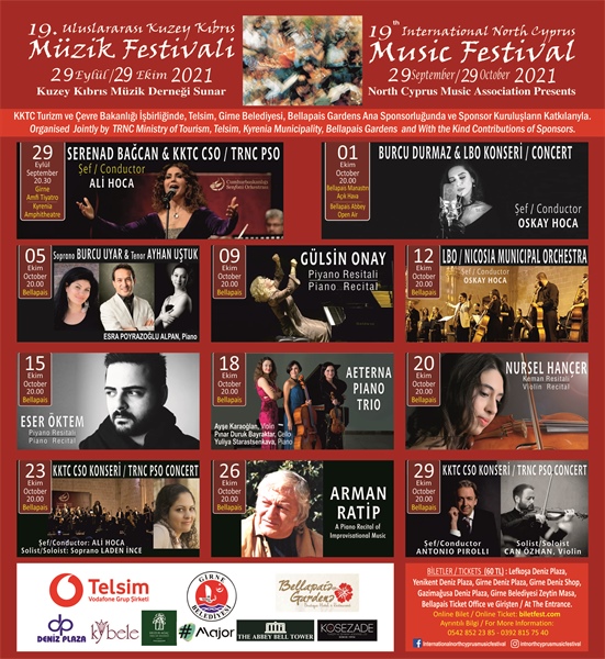 “29 Eylül Girne Amfi Tiyatro Serenad Bağcan & KKTC CSO (Şef: Ali Hoca). 1 Ekim Bellapais Manastırı Açık Hava Burcu Durmaz & LBO Konseri (Şef: Oskay Hoca). 5 Ekim Bellapais Soprano Burcu Uyar & Tenor Ayhan Uştuk (Piano:Esra Poyrazoğlu Alpan). 9 Ekim Bellapais Gülsin Onay Piyano Resitali. 12 Ekim Bellapais LBO Konseri (Şef: Oskay Hoca). 15 Ekim Bellapais Eser Öktem Piyano Resitali. 18 Ekim Bellapais Aeterna Piano Trio. 20 Ekim Bellapais Nursel Hançer Keman Resitali. 23 Ekim Bellapais KKTC CSO Konseri (Şef: Ali Hoca / Solist: Soprano Laden İnce). 26 Ekim Bellapais Arman Ratip Doğaçlama Müziği Piyano Resitali. 29 Ekim Bellapais KKTC CSO Konseri (Şef: Antonio Pirolli / Solist: Can Özhan, Keman).”