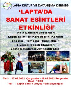 Lapta Sahil Yürüş Yolu başlangıcında saat 19.00’da başlayacak etkinlikte, halk dansları gösterilerş, Lapta Esintileri Korosu’nun mini konseri ve skeçler gibi etkinlikler yer alacak.