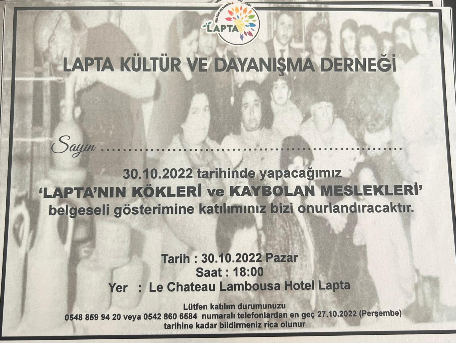 “Lapta’nın Kökleri ve Kaybolan Meslekleri” belgeselinin galası, 30 Ekim Pazar günü saat 18.00’de Le Chateau Lambousa Hotel’de yapılacak.