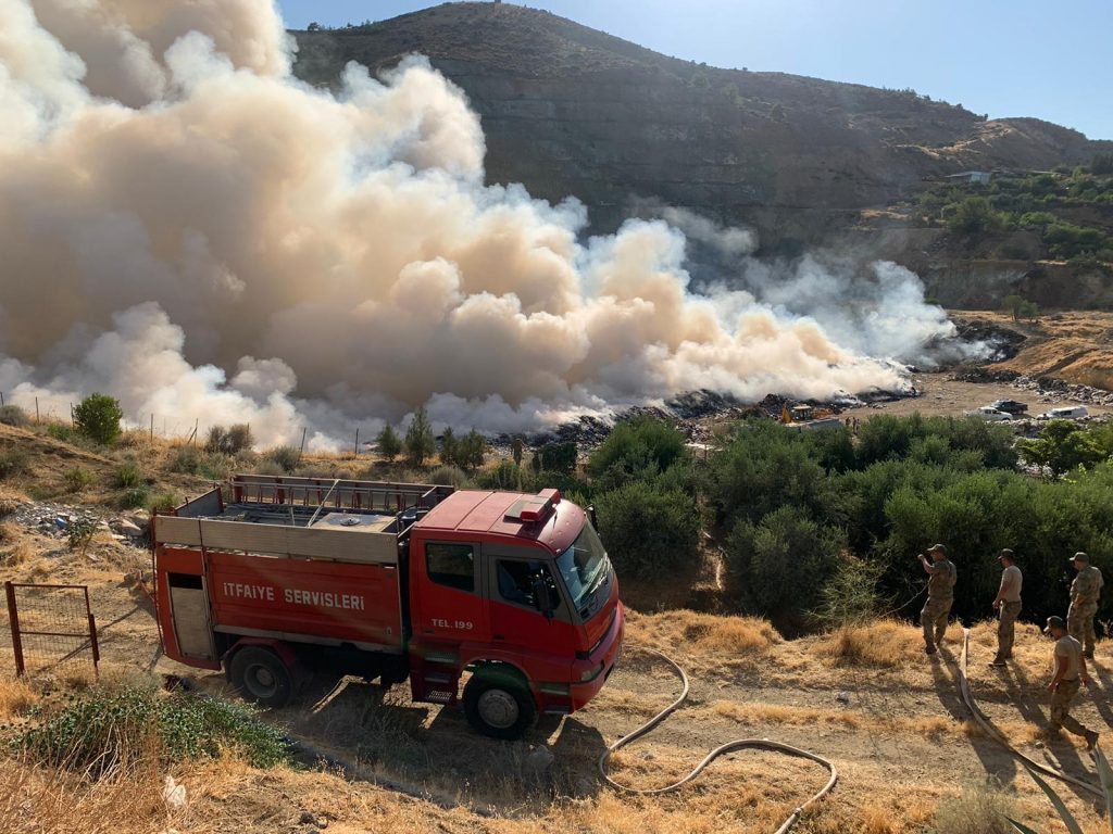 Lefke çöplüğündeki yangın söndürme çalışmalarına paletli dozerle destek verilecek.