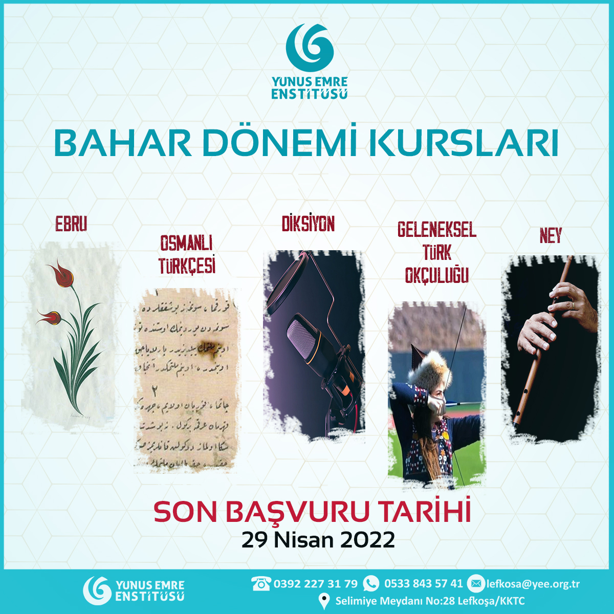 TC Kültür ve Turizm Bakanlığı Tanıtım Sanatçısı Esin Sevgin eğitmenliğinde su ve renklerin ahengini simgeleyen Ebru Sanatı Kursu, Öğr. Gör. A. Alper Ayana eğitmenliğinde Türk tasavvuf musikisinin ruhlara şifa sesli enstrümanı Ney Kursu, Prof. Dr. Oğuz Karakartal eğitmenliğinde Osmanlı Türkçesi ve Diksiyon Kursları ile Fatih Suiçmez eğitmenliğinde çocuk ve yetişkinlere iki ayrı grubun açılacağı atalar mirası Geleneksel Türk Okçuluğu Kursları Lefkoşa Yunus Emre Enstitüsünde katılımcılarını bekliyor.