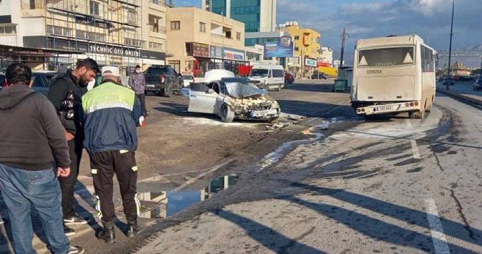 Polis Basın Subaylığı’ndan alınan bilgiye göre bu sabah, saat 07.45 sıralarında, Lefkoşa’da Şht Mustafa Ahmet Ruso Caddesi üzerinde, Hasan Çaylı (E-24), yönetimindeki HF 110 plakalı salon araç ile sol şerit içerisinde kuzey istikametine doğru seyrettiği sırada dikkatsizliği sonucu önünde aynı istikamete doğru seyreden Orhan Saz yönetimindeki TRC 803 plakalı otobüsün arka kısmına çarpmıştır. Çarpmanın etkisiyle kontrolsüzce yoluna devam eden TRC 803 plakalı otobüs sağ şerit içerisinde aynı istikamete doğru seyreden Tarık Dolu yönetimindeki TNL 325 plakalı otobüse çarpmıştır.