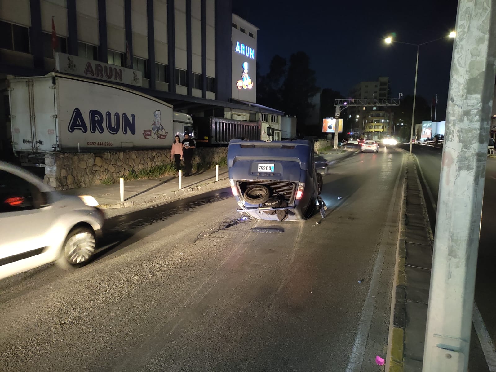Çarpmanın etkisiyle kontrolsüzce yoluna devam eden KD 853 plakalı araç, orta refüje çarpıp yol içinde takla atıp tavanı üzerinde durmuştur.