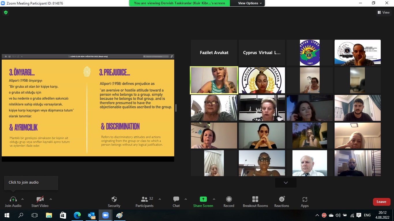 Cyprus Virtual Lions Kulübü Kurucu Başkanı Fikret Şendil moderatörlüğünde iki saat süren toplantıda, Kuzey Kıbrıs’ta LGBTQ+ Hakları, yasal mevzuat, görünürlük, kabul görme ve Kuir Kıbrıs Derneği’nin yürüttüğü projeler hakkında bilgiler paylaşıldı, sunumlar yapıldı.