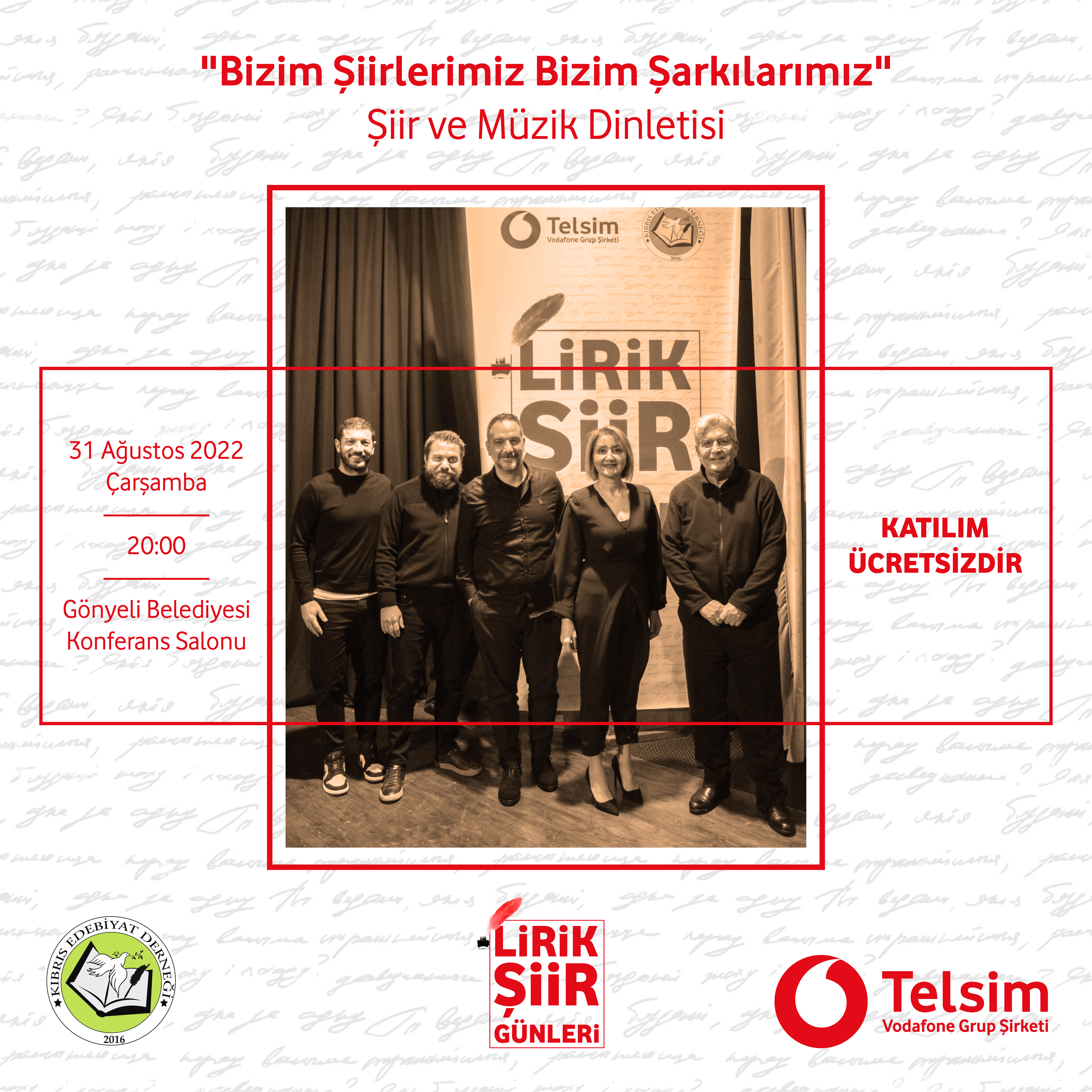 Kıbrıs Edebiyat Derneği çatısı altında faaliyetlerini sürdüren Lirik Şiir Grubu, Telsim ana sponsorluğunda çıktığı 10’uncu yıl turne programında 31 Ağustos Çarşamba akşamı Gönyeli’de sahne alacak.