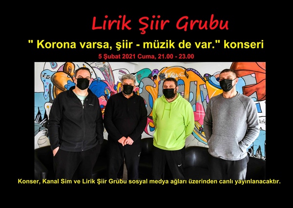 Lirik Şiir Grubu’nun “Korona varsa, şiir-müzik de var” konseri Kanal Sim ve Lirik Şiir Grubu’nun sosyal medya hesapları üzerinden yarın 21.00-23.00 saatleri arasında canlı olarak izlenebilecek.
